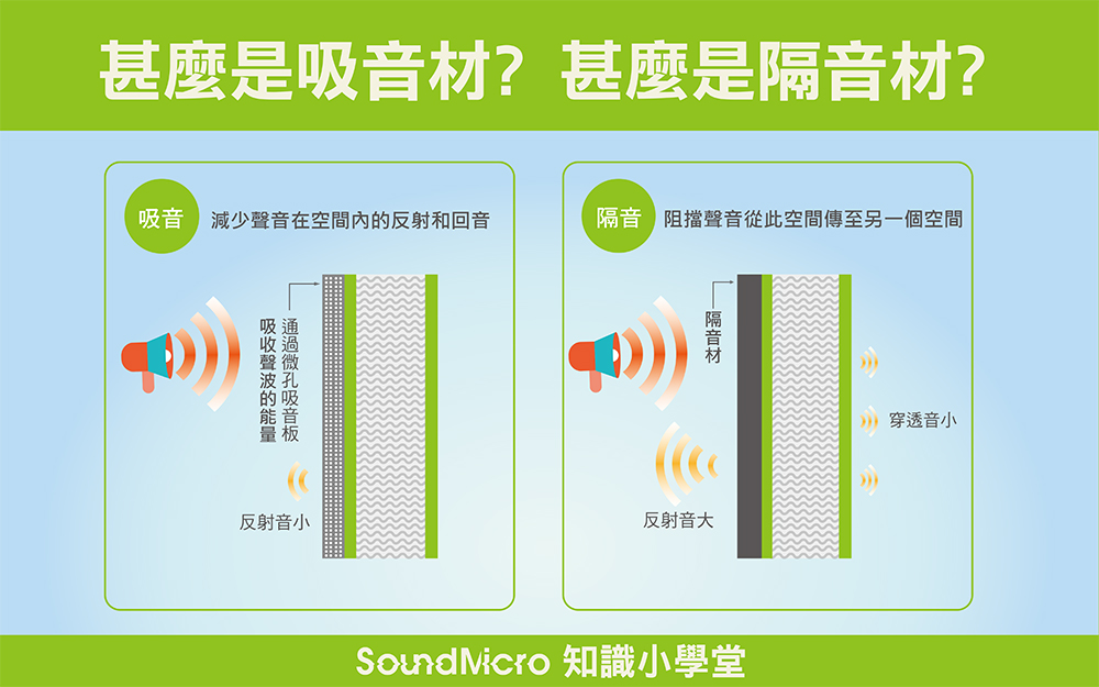 吸音: 減少聲音在空間內的反射和回音,使聲音更清晰,減少混響。