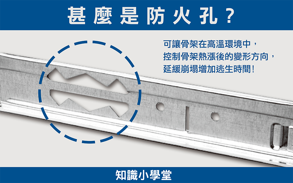 鋼材皆有熱脹冷縮效應,中高階系列輕鋼架在骨架上會設計齒形防火孔,這是一種安全設計!