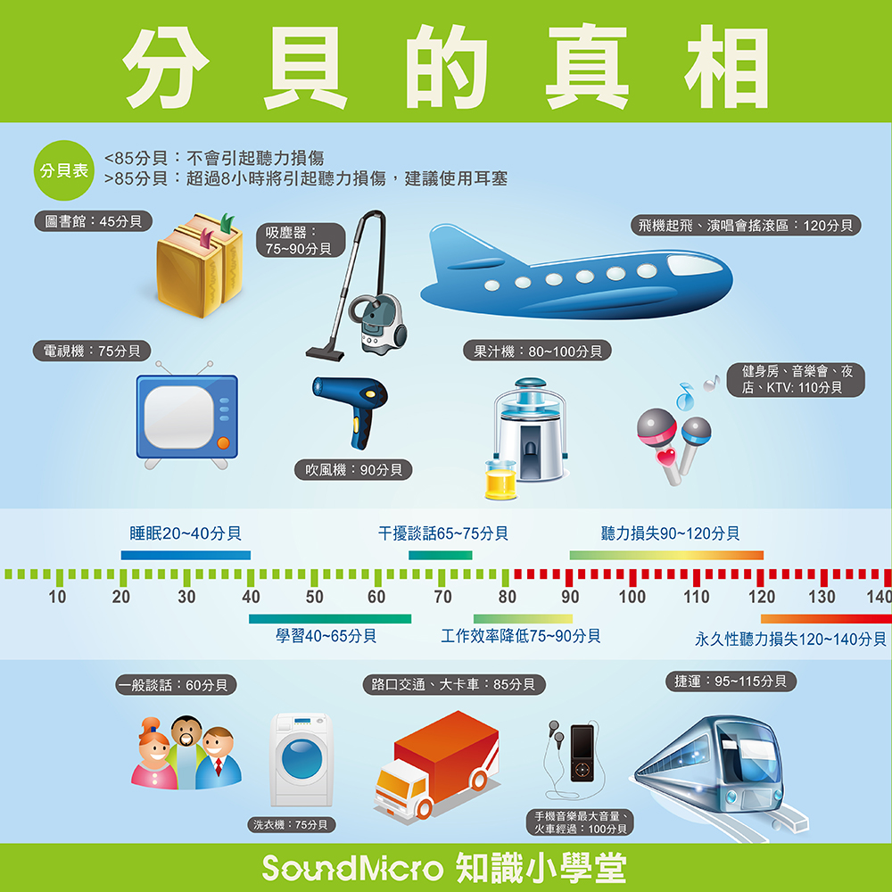 一般談話為60分貝、日常生活中常使用的電視為75分貝、吹風機吸塵器為75-90分貝、而交通聲音火車經過、捷運飛機可達到100-120分貝,如長期下來會影響到我們的聽力,因此在大於85分貝以上的環境超過8小時會建議使用耳塞,以免聽力損傷。