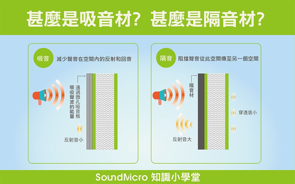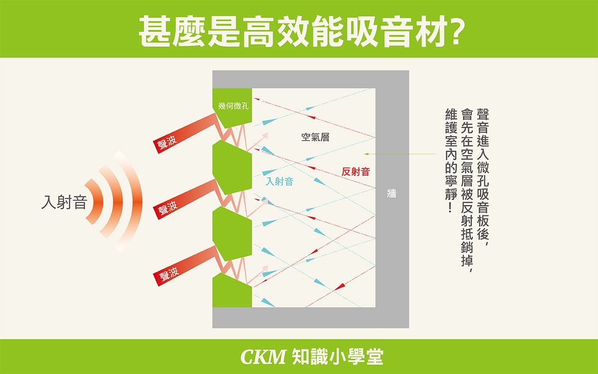 當入射音源穿透『吸音材』時,聲音能量產生大幅度衰減。 高效吸音材吸音係數通常>0.7以上。聲音進入微孔吸音板後,聲音在空氣層中被反射抵銷掉,減少室內空間回音,改善室內噪音!