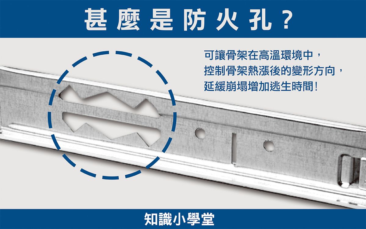 鋼材皆有熱脹冷縮效應,中高階系列輕鋼架在骨架上會設計齒形防火孔,這是一種安全設計!