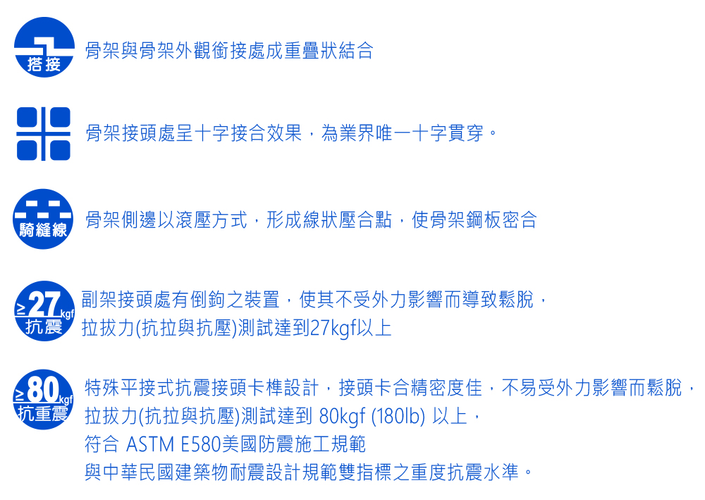 將現代金屬工藝美學,結合具備防火抗震的安全生活因子,雙面烤漆的U型槽縫,以黑色烤漆線條一體成型的設計,是業界唯一黃金比例十字貫穿骨架,卡合精密度佳不易脫落,有方便快速的組裝方式,強化安全結構,呈現立體線條美感的實用價值。